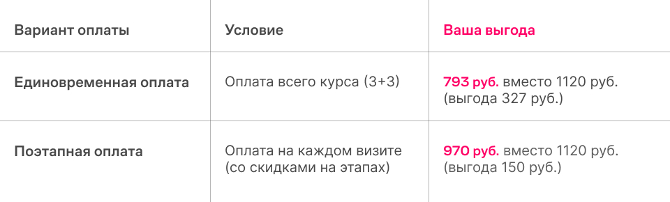 - срок действия программы – 2 месяца с момента покупки при единовременной оплате, 2 месяца с момента первого посещения при пошаговой оплате