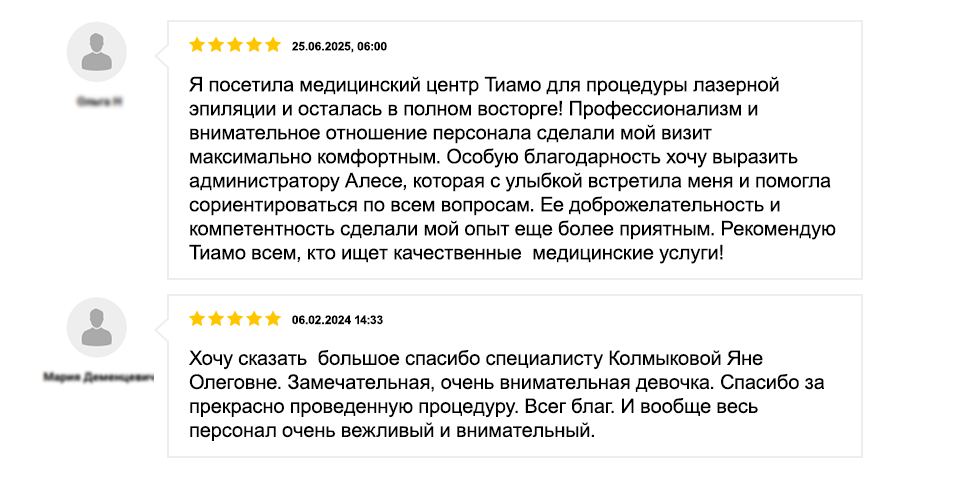 - Оставьте отзыв о процедуре или враче в Instagram с отметкой аккаунта @tiamo_epil, на Яндекс.Картах или Google Maps – получите скидку 10% или 20 рублей.