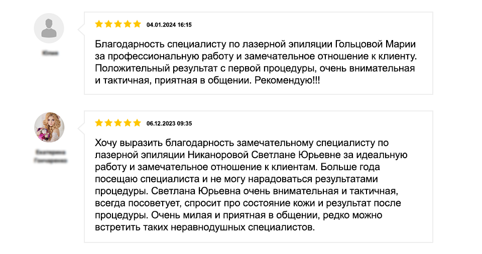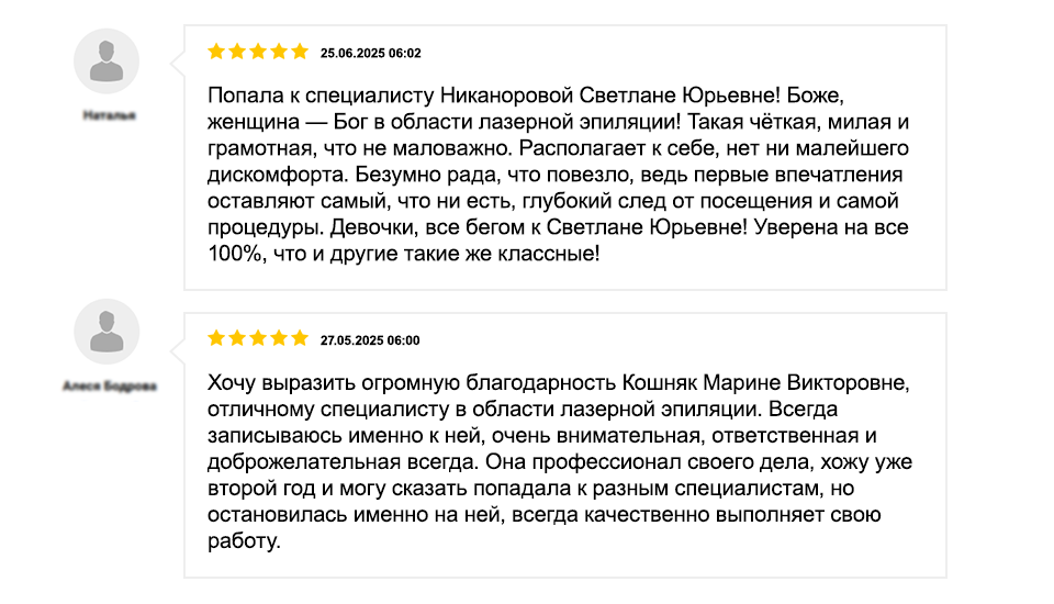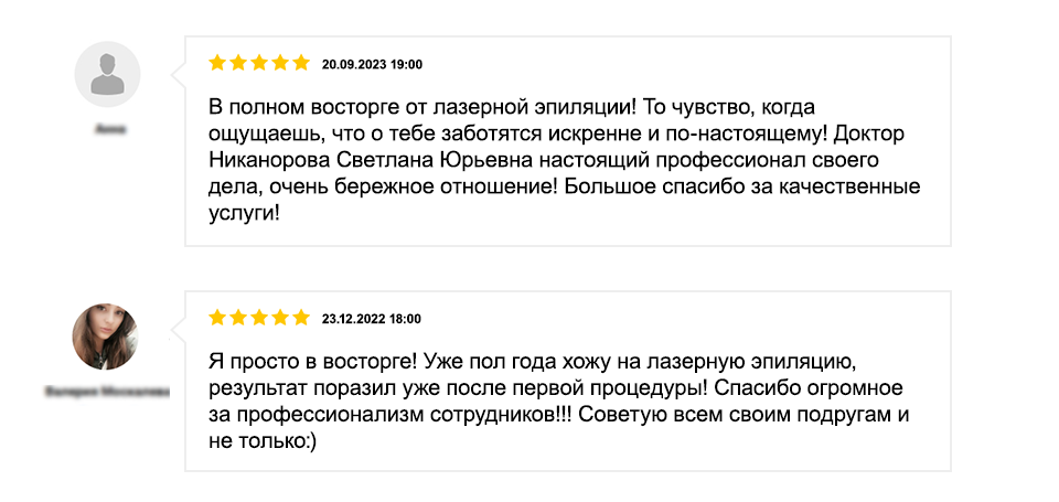 Мы ценим ваше доверие и искренне благодарны за ваши отзывы. Каждый отклик помогает нам становиться лучше, а другим пациентам узнать лучше о процедуре и приносит вам приятные бонусы: